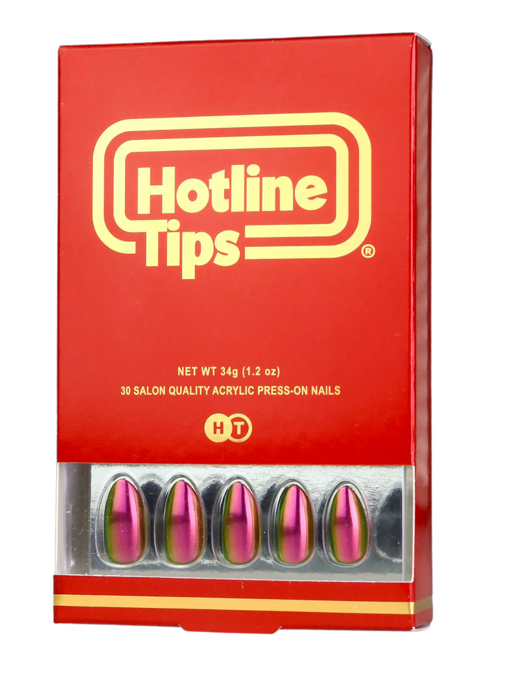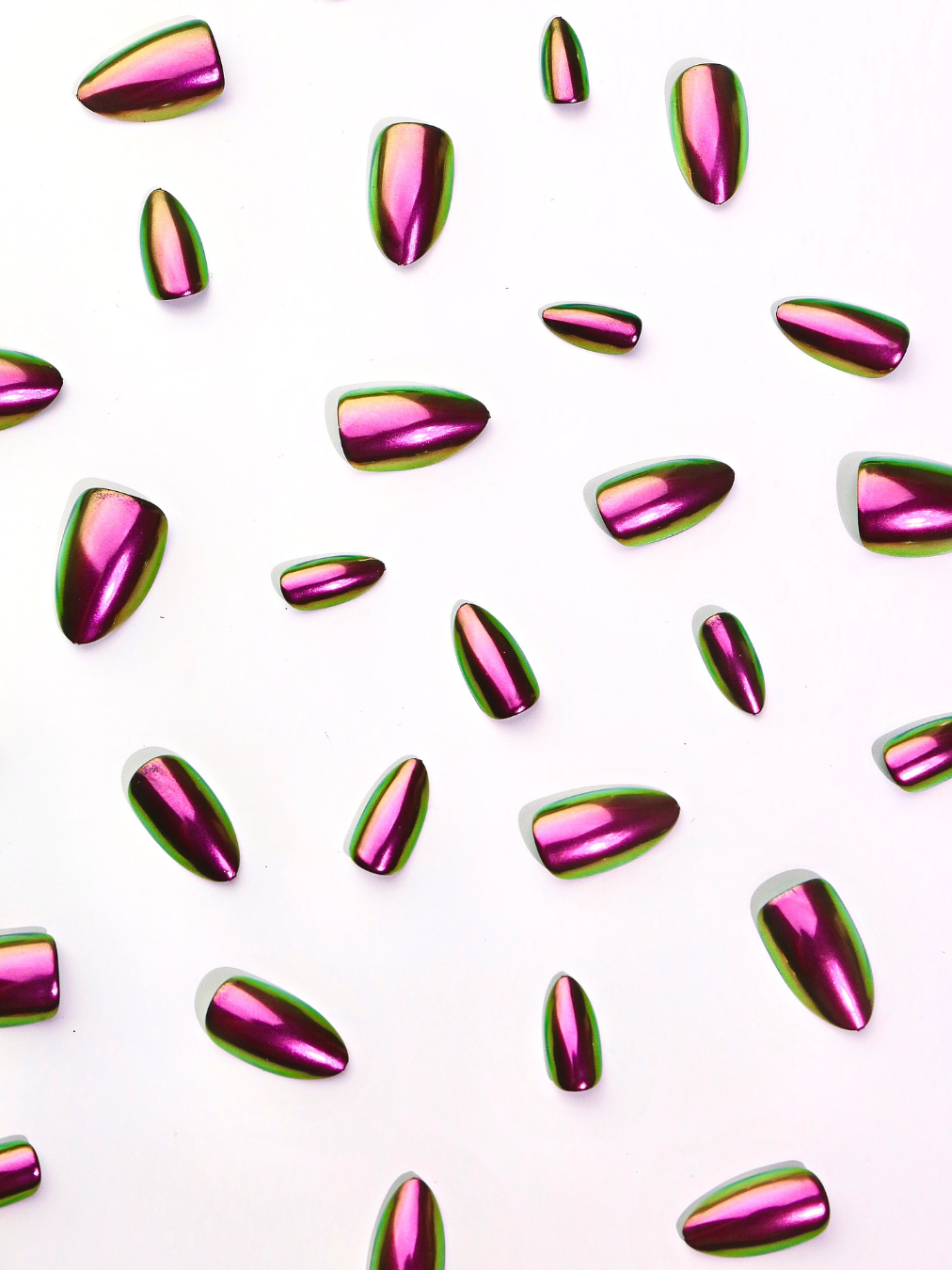 Sharp, chromatic, and impossible to ignore — Malevolent Shine is all expanded domains of danger and glam. Think mirrored obsidian dipped in holographic venom. These tips catch light and twist it into something wicked. Crafted from luxe acrylic with clean, modern edges and paired with stick-on adhesive tabs (so you can vanish as easily as you arrived).