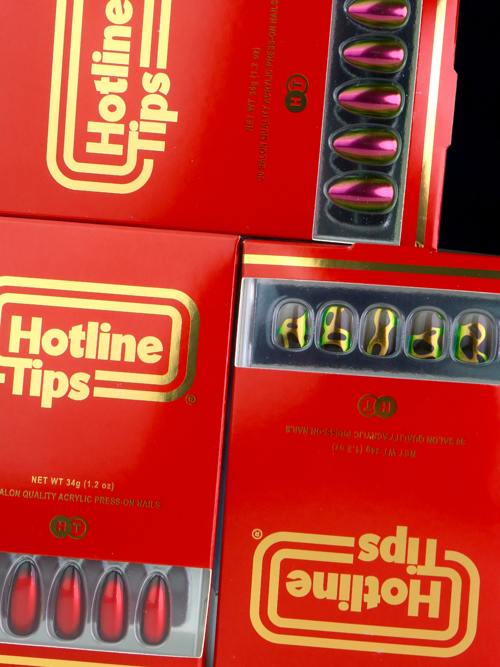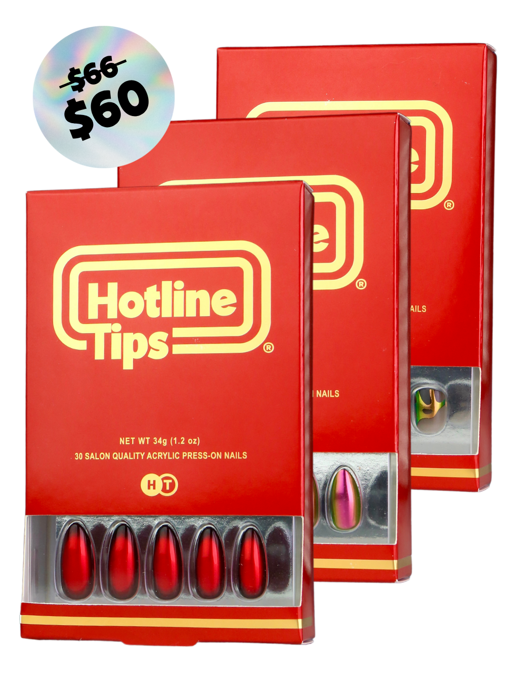 She didn’t just show up — she made an entrance. Volume 1 of the Power-Up Collection is the official debut of Hotline Tips: three high-impact, mood-shifting press-on sets designed for maximum drama and minimal effort.